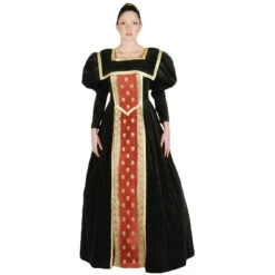 Forest green and gold, lace up back, top with separate floor length skirt (2 piece) and matching renaissance headpiece.